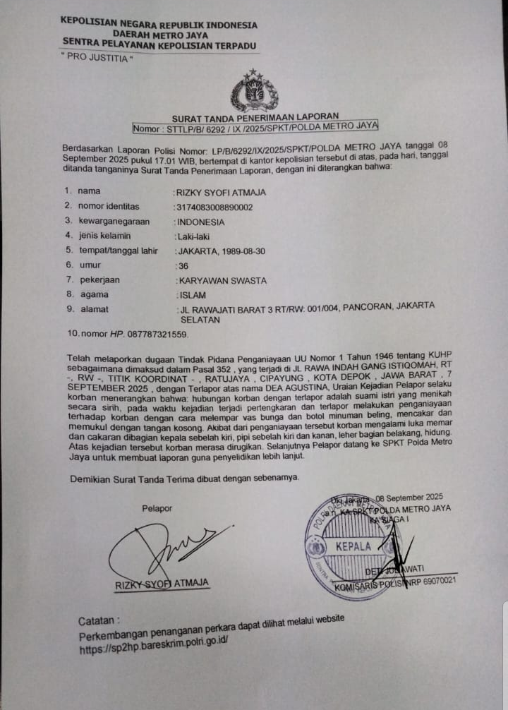 Pasalnya Korban Rizky Tile telah melaporkan DA ke ruang pengaduan Sentra Pelayanan Kepolisian Terpadu (SPKT) Polda Metro Jaya, pada Senin (08/09/25) sore dengan no Laporan Polisi LP/B/6292/IX/2025/SPKT/Polda Metro Jaya dan laporan nya telah dilimpahkan ke Polres Metro Depok hingga saat ini terkesan jalan ditempat.