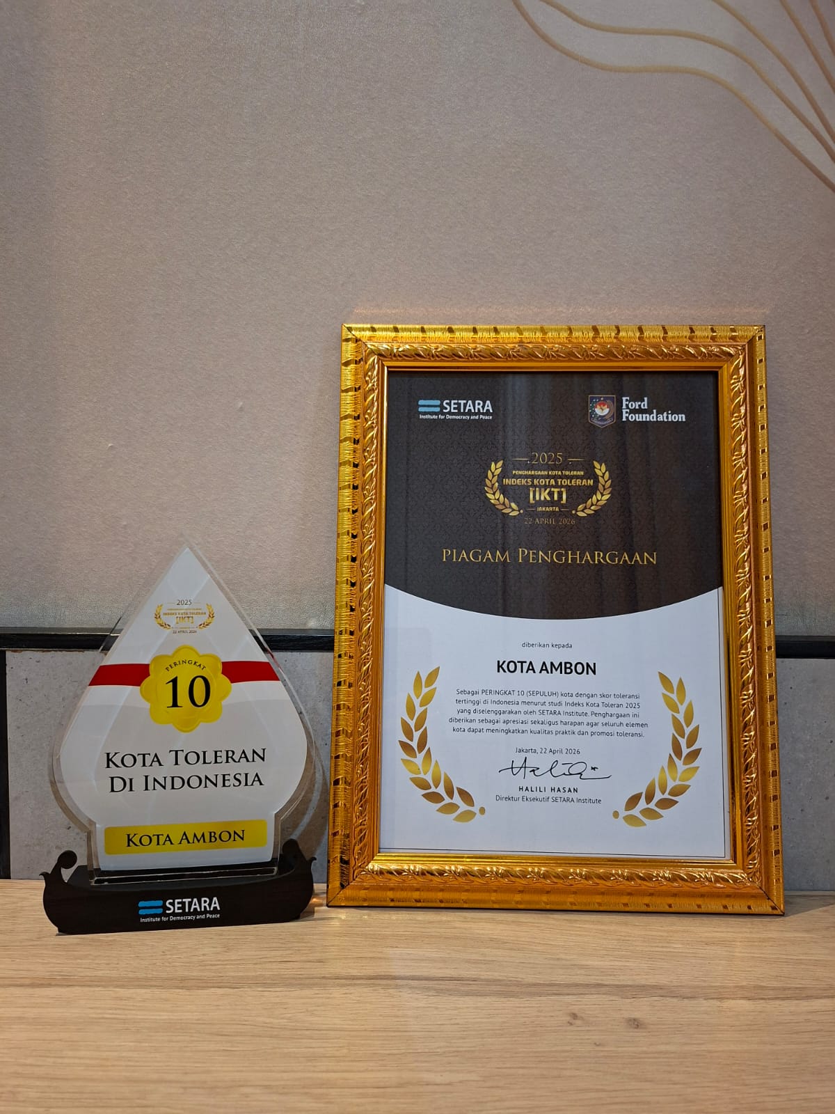 JAKARTA METRO REPORTASE,COM PPID- Kota Ambon berhasil menduduki peringkat ke 10 Indeks Kota Toleran (IKT) Tahun 2025 dengan Skor 5,657 berdasrakan penilaian SETARA Institute yang diluncurkan Rabu (22/4/26) di Mangkuluhur Arthotel Suites, Jakarta,.